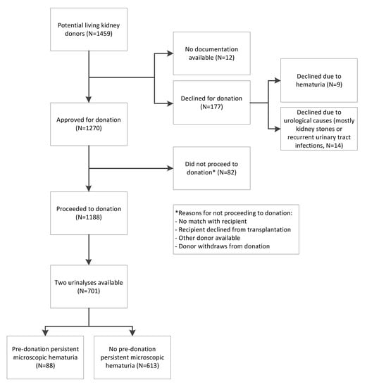- Koushik, R.; Garvey, C.; Manivel, J.C.; Matas, A.J.; Kasiske, B.L. Persistent, asymptomatic, microscopic hematuria in prospective kidney donors. Transplantation 2005, 80, 1425–1429. [Google Scholar] [CrossRef] [PubMed]