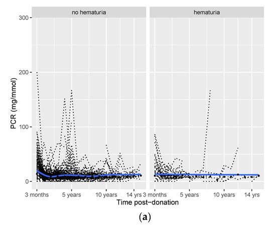 The mean/median values of post-donation PCR, eGFR, and SBP over time are provided in Table S4. The post-donation courses of PCR, eGFR, and SBP were similar among donors with hematuria and those without hematuria (Figure 1). Potential differences between the two groups for the three outcomes over time were tested in generalized linear mixed models (Table 2). In this table, the upper number (hematuria) represents the difference between the hematuria and non-hematuria group at the first visit after donation (at three months). Time represents the course of the outcome after three months for the non-hematuria group, and time*hematuria represents the difference in the post-donation course of the outcome between the hematuria and non-hematuria group. Three months after donation, PCR was 0.28 mg/mmol higher in donors with pre-donation hematuria vs. donors without pre-donation hematuria (p = 0.05). However, after three months, PCR increased by 0.04 mg/mmol per year in donors with no pre-donation hematuria (p < 0.001), while it only increased by 0.02 mg/mmol per year (time + hematuria×time = 0.04 + (−0.02) = 0.02, Table 2) in donors with pre-donation hematuria.