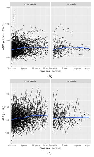 Post-donation course of protein/creatinine ratio (PCR (a)), eGFR (b), and SBP (c) in donors with vs. without pre-donation hematuria. Smooth curves (blue lines) with 95% confidence intervals (grey areas), individual trajectories (dashed black lines), and mean (median for PCR) values for each time point (black dots).