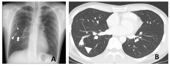 A 26-year-old male with a pulmonary arteriovenous malformation (PAVM) at the apical segment of the right lower lobe. Posterior–anterior chest radiograph (A) shows a right mid-zone pulmonary nodular opacity (arrowhead) with two cord-like structures arising from the medial margin of the lesion and directed toward the hilum. These are the feeding artery (thin arrow) and the draining vein (thick arrow). Axial contrast-enhanced computed tomography (B); lung window shows the same right lower lobe PAVM (arrowhead) with the partially-imaged feeding artery (thin arrow).
