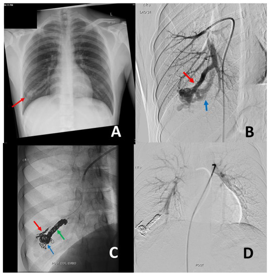- Shovlin, C.L.; Condliffe, R.; Donaldson, J.W.; Kiely, D.G.; Wort, S.J.; British Thoracic Society. British Thoracic Society Clinical Statement on Pulmonary Arteriovenous Malformations. Thorax 2017, 72, 1154–1163. [Google Scholar] [CrossRef]