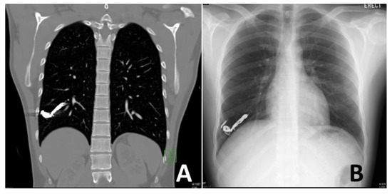 Three-month follow-up imaging of the patient treated in Figure 3. The patient was well with no residual shortness of breath. His saturation on room air also increased to 98%. The coronal contrast-enhanced computed tomography (A) and posterior-anterior chest radiograph (B) demonstrate the tightly packed coils with no evidence of flow recurrence or any new complications.