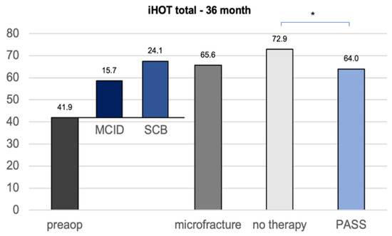 Figure 3. CIOVs of the iHOT33 36 months after hip arthroscopy with or without microfracture of the apparent cartilage defects. MCID minimum clinically important difference SCB substantial clinical benefit (change) PASS patient acceptable symptom state. Significant differences (* p < 0.05) are designated by asterisks.