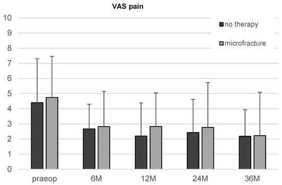 There was an apparent reduction in the VAS score in both, the microfracture and the untreated group, from the first follow-up on. However, the improvement over time did not reach statistical significance.