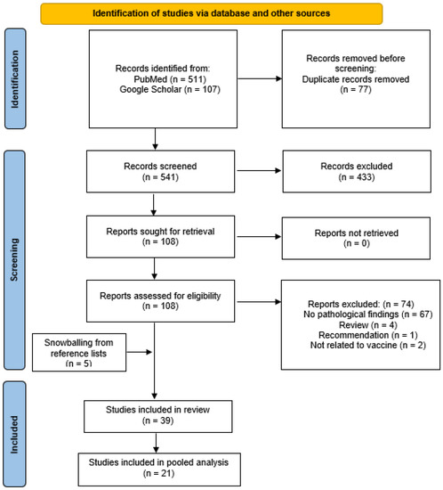 An initial search of PubMed and Google Scholar yielded a total of 618 results, with 77 duplicates, and 541 results were screened (Figure 1). After excluding 428 articles, 108 full-text articles were obtained and assessed for eligibility. After excluding 74 articles for the reasons stated in Figure 1, and with the addition of 5 articles identified from the reference lists of articles, 39 articles were included in this review and 21 COVID-19 studies were included in the pooled analysis. A total of 25 studies [,,,,,,,,,,,,,,,,,,,,,,,,] were relevant to the COVID-19 vaccine and 14 studies [,,,,,,,,,,,,,] were related to non-COVID-19 vaccines.