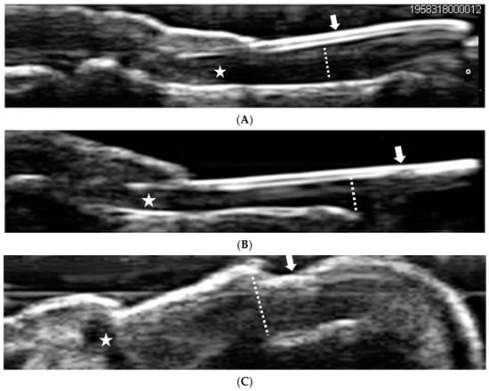 Comparison health control with nail psoriasis. (A). Grayscale ultrasonogaphy of the fingernail in a healthy control. Arrow: trilamellar and convex structure of nail plate with two hyperechoic lines, ventral and dorsal, separated by a hypoechoic line. Dashed line: the diameter of the nail bed is thinner in the distal part than the proximal. Asterisk: nail matrix present. (B). Grayscale ultrasonography of the fingernail in mild psoriatic nail disease. Arrow: interruption of hyperechoic line and loss of convex structure of nail plate (Wortsmann type II). Dashed line: loss of thinner distal part of nail bed. Asterisk: nail matrix present. (C). Grayscale ultrasonography of the fingernail in severe psoriatic nail disease. Arrow: a single and wavy hyperechoic layer losing its normal trilamillar appearance (Wortsmann type IV). Dashed line: thickening of nail bed. Asterisk: loss of normal nail matrix structure.