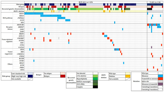 A complex karyotype is defined as more than or equal to three chromosomal aberrations, including at least one structural aberration. Clinical characteristics, including median age and WBC count at diagnosis, and NCI and overall risk groups between non-relapsed and relapsed cases of ALL were compared using the Mann–Whitney test and Pearson’s chi-square test. The spectrum and number of genetic mutations for BCP-ALL and T-ALL were compared using Fisher’s exact test and the Kruskal–Wallis test. Event-free survival (EFS) and OS were determined via the Kaplan–Meier method, with comparisons of survival rate performed using a log-lank test. The date of the last follow-up was 28 February 2021. p < 0.05 was considered statistically significant. SPSS version 24.0 (SPSS, Chicago, IL, USA) was used for all statistical analyses.