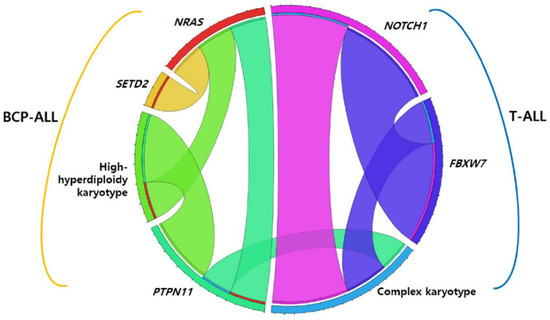 Although ALL with high hyperdiploidy (51–67 chromosomes) generally represents a favorable prognostic subtype, less than 20% of these patients experienced disease relapse [30]. Studies have reported a high incidence of RAS pathway mutations in patients with high hyperdiploidy and have linked it to disease recurrence [27,31]. We also observed that RAS pathway mutations occurred in more than half of ALL patients with high hyperdiploidy (67.8%) with a significant association, particularly between a high hyperdiploidy karyotype and NRAS-PTPN11 mutation. In this study, ALL patients with high hyperdiploidy harbored more somatic mutations than patients with other recurrent translocations, such as ETV6-RUNX1 and TCF3-PBX1. Among them, ETV6-RUNX1-positive ALL patients harbored the least number of somatic variants.