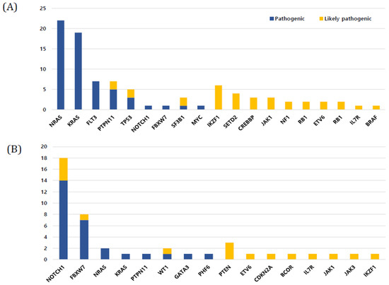 Frequency of mutations in study cohort. (A) B-cell precursor acute lymphoblastic leukemia (ALL) (B) T-cell ALL.