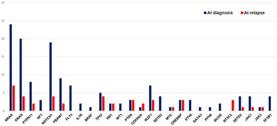 NGS was performed using a St. Mary’s customized NGS panel for acute leukemia, i.e., the “SM Acute leukemia panel”. Ion AmpliSeq Technology was used to amplify 67 genes (Supplementary Table S1) using an Ion Chef™ system and an Ion S5 XL Sequencer (all from Thermo Fisher Scientific, Waltham, MA, USA) [20]. Sequenced reads were mapped to the human reference genome (hg19, Genome Reference Consortium, February 2009). Annotated variants were classified into four tiers according to the Standards and Guidelines of the Association for Molecular Pathology [21]. Bioinformatics analysis was carried out using both customized and manufacturer-provided pipelines. Variants were selected and annotated using analytics algorithms and public databases [22]. All mutations were manually verified using the Integrative Genomic Viewer [23]. Among the 139 patients, 106 patients and 19 patients were analyzed with samples at diagnosis and at relapse, respectively, while 14 patients were analyzed with both samples.