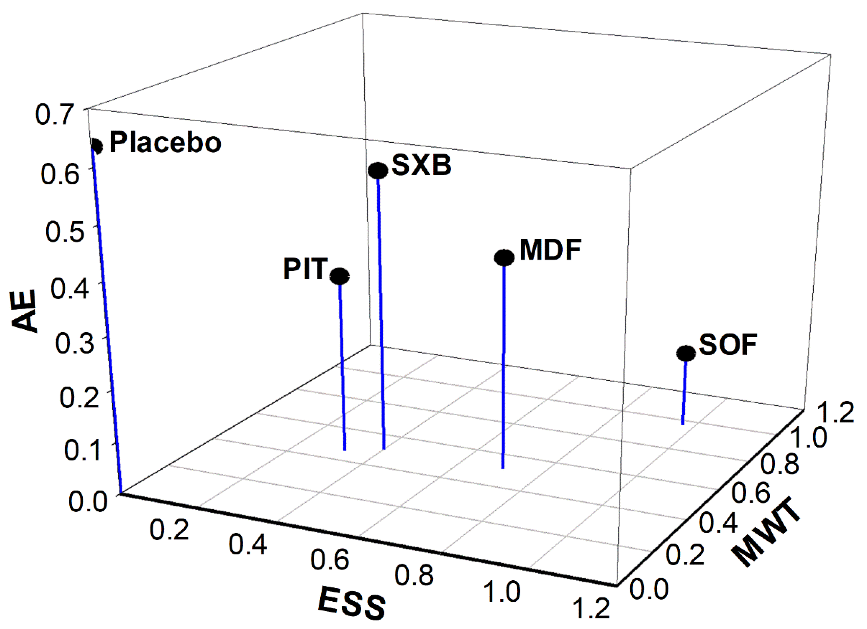 | −2.88 (−4.89–−0.88) | −1.49 (−3.07–0.09) | −1.12 (−3.70–1.46) | −0.32 (−2.46–1.82) | Pitolisant | ||