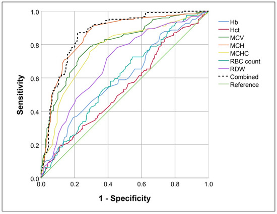 The receiver operator characteristic (ROC) curve was created to show the diagnostic performance of red blood cell parameters in predicting the α+-thalassemia trait against normal controls. Red blood cell parameters were used as a single parameter and a combination model derived from a conventional binary logistic regression analysis.