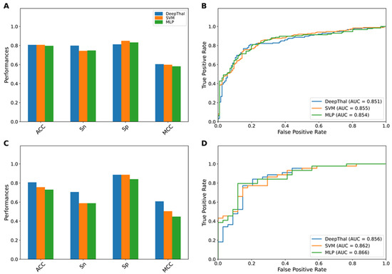 Performance comparison of the top three ML-based models on the training (A,B) and independent test (C,D) datasets. Prediction results of the top three ML-based models in terms of ACC, Sn, Sp, and MCC (A,C). ROC curves and AUC values of the top three ML-based models (B,D). SVM, support vector machine; MLP, multilayer perceptron; ACC, accuracy; AUC, area under the curve; MCC, Matthews correlation coefficient; ML, machine learning; Sn, sensitivity; Sp, specificity.