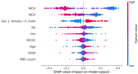 Here, we employed the Shapley Additive exPlanation (SHAP) method [16] for elucidating the contribution of each feature to the prediction outcomes and highlighting the most important feature. Figure 3 shows the SHAP values of all the RBC indices, where positive and negative SHAP values represent the α+-thal trait and control predictions, respectively. As can be seen, the top three important features for DeepThal consisted of the MHC, MCV, and sex. The SHAP values of the MHC and MCV were relatively low for most of the α+-thal trait patients and high for most of the control patients. As a result, given an unknown patient, low values of these two indices indicate that the patient is predicted as α+-thal trait; otherwise, the patient is predicted as a control case.