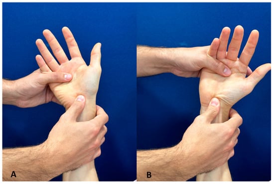- LaStayo, P.; Howell, J. Clinical provocative tests used in evaluating wrist pain: A descriptive study. J. Hand Ther. 1995, 8, 10–17. [Google Scholar] [CrossRef]