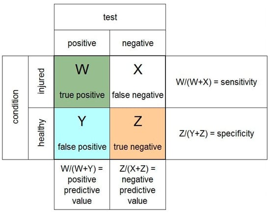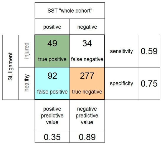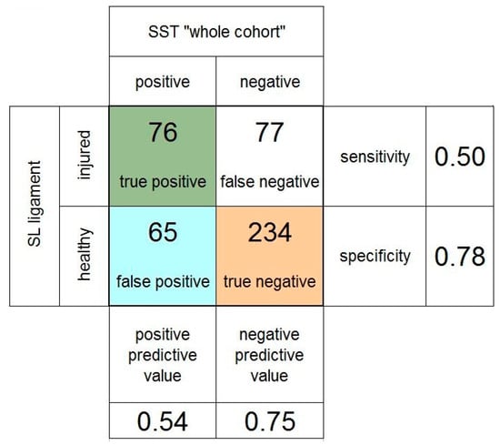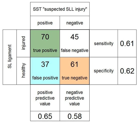 Figure 6 summarizes the subgroup analysis of patients who were specifically referred to the clinic for a suspected SLL injury. The PPV (0.65) and the sensitivity (0.61) were higher, and the NPV (0.58) and the specificity (0.62) were lower when compared to the values of the whole collective.