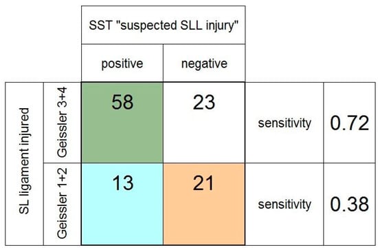 Fourfold table of the scaphoid shift test (SST) in the subgroup of patients referred specifically for suspected scapholunate (SL) ligament injury, depending on the severity of the SL ligament injury (grade 1 + 2 vs. grade 3 + 4, according to the Geissler classification).