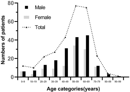 Overall, 294 patients with GBS were identified in our hospital from 2015–2020. We found that there was a higher proportion of male than female, which was consistent with other studies [,]. The incidence of GBS in both men and women increased with age, peaking at the age 50–69 years. A similar conclusion was found in other regions worldwide []. However, in the early 1990s, GBS patients were mainly children and young adults, which indicated that the onset age of GBS has changed [].