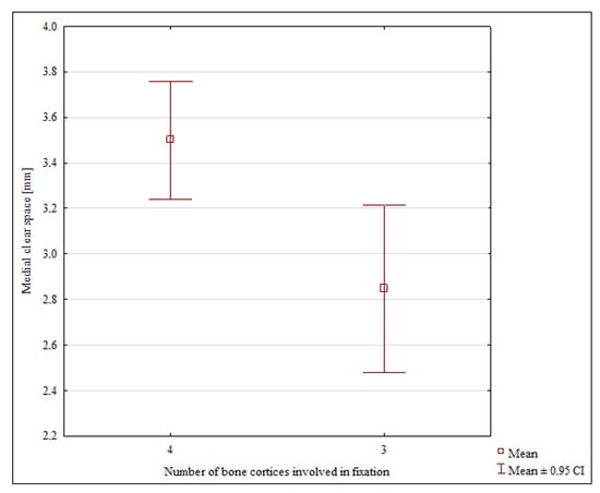 Medial clear space values in the tricortical and quadricortical fixation groups.