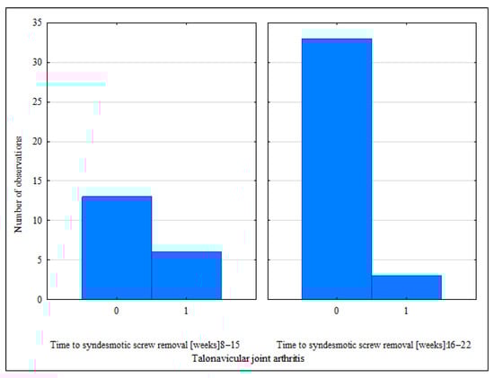 Schepers et al. observed no differences in the American Orthopedic Food and Ankle Society (AOFAS) score, the Olerung and Molander Ankle Score (OMAS), or the visual analog scale (VAS) score, irrespective of the period of time after which the syndesmotic screw was removed [4]. Our study findings indicated that the duration of the screw fixation had no effect on most of the evaluated radiographic parameters. It was only the postoperative TF overlap that was below the lower level of normal in the 8–15-week fixation group, and the proportion of patients with talonavicular joint arthritis at the final follow-up was significantly higher in the 16–22-week fixation group. A comparison of the parameters assessed postoperatively and at the final follow-up in the two groups with a different duration of screw fixation revealed the development of arthritis and a worsened TF overlap.