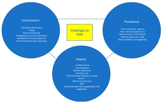The risks associated with EAM are multifactorial and are attributed to patient-related, procedure-related, and environmental-related factors (Figure 1) [7]. Patients who require EAM are often hemodynamically unstable and may not tolerate the hemodynamic perturbations associated with endotracheal intubation. Efforts to provide preoxygenation prior to intubation may be difficult or less effective due to patient agitation, hemodynamic instability, and ventilation-perfusion mismatch. Less effective preoxygenation limits the amount of time available to secure the airway before the development of dangerously low oxygen saturation levels and cardiopulmonary collapse. Poor tissue perfusion may result in inaccurate or unmeasurable oxygen saturation (SpO2) readings, which further confound patient assessment and monitoring. Hypoxemia, hypercarbia, and respiratory distress result in increased sympathetic outflow, which elevates blood pressure and may result in a false sense of “hemodynamic stability”, followed by an exaggerated drop in blood pressure once the airway is secured. Induction medications, given to facilitate intubation, can worsen hypotension by decreasing systemic vascular resistance and depressing myocardial contractility. Patients requiring EAM often have full stomachs and are at increased risk for aspiration of gastric contents. Anatomical abnormalities such as cervical spine instability, orotracheal or laryngeal tumors, history of neck radiation, airway edema or stenosis, or prior airway instrumentation are additional risk factors for adverse events during EAM. Lastly, the increasing prevalence of obesity and the number of patients who receive anticoagulation increase the risk of EAM-related complications.