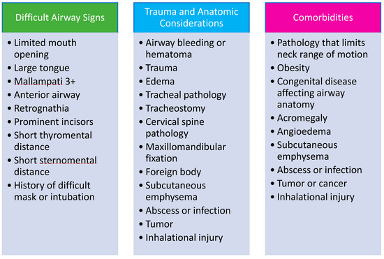 Figure 4. Characteristics of High-Risk Patients and Factors Suggestive of Difficult Airway Management. Data from Damrose JF, Eropkin W, Ng S et al. [24], Atkins JH, Rassekh CH, Chalian AA et al. [25], Atkins JH, Rassekh CH [27] and Feinleib J, Foley L, Mark L. [33].