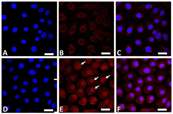 Immunofluorescence staining of AHR (red fluorescence) in human keratinocytes. Nuclei were stained with 4′,6-diamidino-2-phenylindole (DAPI). Nonstimulated control keratinocytes ((A); DAPI staining, (B); AHR staining, (C); merged). GFF-treated keratinocytes ((D); DAPI staining, (E); AHR staining, (F); merged). AHR resides mainly in the cytoplasm in nonstimulated keratinocytes (B). GFF induces nuclear translocation of AHR ((E), arrows). AHR: aryl hydrocarbon receptor. GFF: Galactomyces ferment filtrate. Bar; 25 μm.