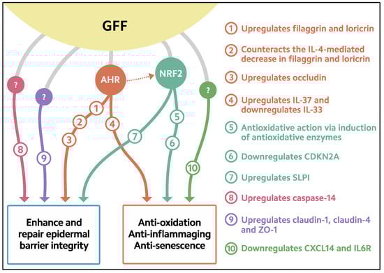 Recent advances in skin biology not only provide rational evidence and a strategy for understanding the beneficial effects of cosmetic ingredients, but can also help to improve the efficacy of skincare products in treating various skin complaints. Ceramide- and NMFs-containing skincare products are good examples of treatments that significantly alleviate signs of dry skin, even in inflammatory skin diseases [51,52,53]. GFF is a functional cosmetic ingredient whose adoption was inspired by the empirical observation that sake brewers often had youthful and soft skin on their hands. GFF has since been shown to be a potent dual agonist for AHR and NRF2. The GFF–AHR axis upregulates filaggrin production and induces the expression of antiinflammatory IL-37, with subsequent downregulation of the expression of proallergic IL-33. The GFF–NRF2 axis provides a potent antioxidative effect and is probably beneficial in preventing inflammaging, partly through the downregulation of CDKN2A. GFF might also ameliorate inflammaging by downregulating the expression of CXCL14 and IL6R. In addition, GFF increases the expression of caspase-14 and claudins, which are essentially involved in epidermal terminal differentiation and tight-junction maturation.