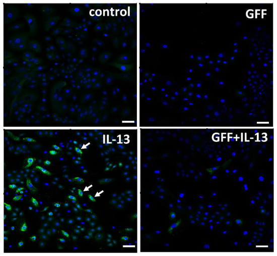 GFF significantly ameliorates both TNF-α-induced [10] and UVB-induced [76] production of ROS in human keratinocytes. IL-13 is also an ROS-inducing cytokine [78]. IL-13-induced ROS production in keratinocytes is also inhibited by GFF (Figure 4).