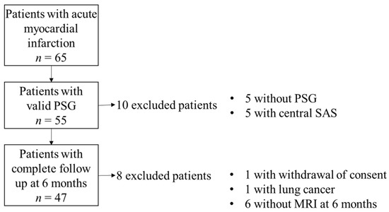 Between May 2015 and January 2020, 65 patients who underwent percutaneous coronary intervention to treat AMI were eligible for the prospective study. Among them, 18 patients were excluded due to the absence of CMR at six months (n = 6) or baseline polysomnography recording (n = 5), a SAS with predominant central part (n = 5), a cancer (n = 1), or a consent withdrawal (n = 1) (Figure 1).