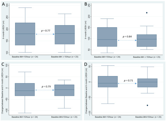 Differences between patients with an AHI < 15/h and patients with an AHI ≥ 15/h for: (A) six-month left ventricular end-diastolic volume (LVEDV); (B) left ventricular end-systolic volume (LVESV); (C) changes between baseline and six months in LVEDV; and (D) LVESV.