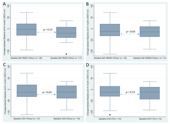Changes between baseline and six months in LVEDV between patients with: (A) AHI-REM < 15/h and ≥15/h; (B) AHI-NREM < 15/h and ≥15/h; (C) oxygen desaturation index (ODI) < 15/h and ≥15/h; and (D) Epworth sleepiness scale (ESS) ≤ 10 and >10.