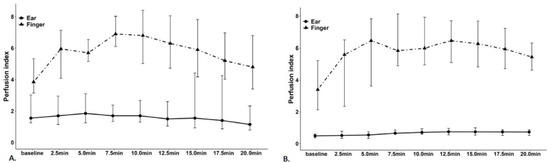 The ear was relatively immune to vasoconstrictive challenges, making ear plethysmograph waveforms suitable for monitoring central hemodynamic status [23,24,25]. In addition, proximity to the brain ensures adequate perfusion by arteries from the vascular system to supply the brain [26]. While shock-induced centralization inhibits peripheral pulse oximetry due to peripheral perfusion deficiency, in-ear pulse oximetry is unlikely to be affected [23,24,27]. Consistent with the present study, the PI of the ear showed less variation than that of the finger (Figure 1A, B). This result supports the hypothesis that the environment has less influence on in-ear pulse oximetry. For this reason, PI determined from the plethysmograph ear waveform provides reliable data about hemodynamic status.