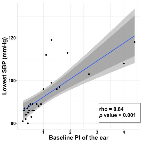We found a correlation between the baseline PI of the ear and the lowest SBP in the post-induction period for all participants. Recently, it was demonstrated that PI not only tracks systemic hemodynamic changes but could also be an early predictor of central hypovolemia and compensatory sympathetic activation in healthy volunteers. Højlund et al. [44] demonstrated in their study that mean arterial pressure was highly correlated (rho [95% CI] = 0.9 [0.7–1], p < 0.001) with the PI of the finger, and displayed simultaneous tracings of the mean arterial pressure and PI during general anesthesia. The pathophysiology of changes in hypertension over time may also have been exhibited in the present study’s high correlation between the PI of the ear and SBP.