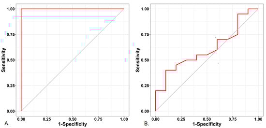 Comparing the receiver operating characteristic curves of the perfusion indices of the (A) ear and (B) finger.