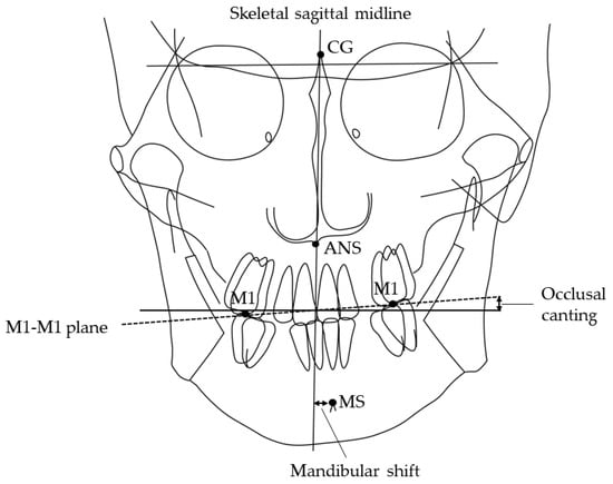 Information regarding sex, age, and tooth extraction was obtained from clinical records. Canine and molar anteroposterior relationships, open bite, and crossbite were recorded from the dental cast. All patients have an ideal molar relationship after completion of orthodontic treatment: no categorization of malocclusion was necessary. The patient’s head was affixed with the ear rods, and the Frankfurt plane was made parallel to the floor when postero-anterior and lateral cephalometric radiographs (Hyper-X, ASAHI., Tokyo, Japan) were taken [,,]. The source-to-subject and subject-to-film distances were always fixed. The following parameters were determined: ANB angle, mandibular plane angle, mandibular shift [,], and occlusal canting []. The amount of mandibular shift was measured through the distance of the skeletal sagittal midline to the mental spine. The facial sagittal midline is constructed from the crista galli through the anterior nasal spine (ANS) to the chin area (Figure 1). Occlusal canting is represented by the angle of the maxillary intermolar (M1-M1) plane and the line that is perpendicular to the skeletal sagittal midline. The aforementioned values were measured three times on different days seven days apart, using software (Winceph ver.9.0, Rise Corp., Tokyo, Japan), and the average value was calculated. The cephalometric radiographs were traced and analyzed by a single investigator (SA). Statistical analyses were performed to determine possible correlations among groups. All parameters of cephalometric radiographs were randomly re-measured, and errors were calculated by Dahlberg’s formula []; on average, the method error was 0.15° for the ANB angle, 0.05 mm for the mandibular shift and 0.01° for the occlusal canting. Inter-group comparisons were carried out using a one-way analysis of variance and Chi-square test.