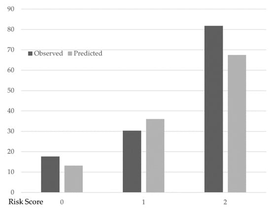 The number of factors associated with the change in PCS was assigned as two when there were two or more factors. In this model, one point was assigned for each of the three factors associated with PCS change such that the factor associated with the change in PCS had a score ranging from 0 (i.e., no factor) to 3 points (i.e., all factors). Table 3 shows the predicted and observed probabilities of PCS change. Overall, 41 patients had no factor (i.e., 0 points), 56 had 1 factor, and 11 had two or more factors. The proportion of those for whom PCS change was observed was 17.1% (7/41) for no factor associated with the change in PCS, 30.4% (17/56) for one factor, and 81.8% (9/11) for two factors. These proportions were well predicted in the multivariable logistic regression model: the predicted probability of PCS change was 13.2% for no factor, 36.0% for one factor, and 67.5% for two factors (Figure 2).
