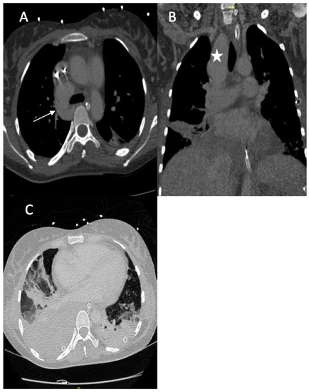 (A) Axial image from the contrast-enhanced thoracic CT scan revealed an arteriovenous fistula between the apical segmental artery and the azygos vein (arrow); (B) coronal section of the CT scan revealed a pseudoaneurysm of the right lobe superior artery (star); (C) axial image thoracic CT scan (pulmonary window) showed bilateral pleural effusions with ground glass opacity, most likely due to pulmonary hemorrhaging.