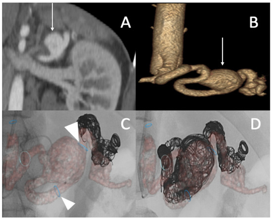 (A,B) Abdominal CT angiogram with 3D image and arteriography with image fusion (C,D) showing the aneurysm in the splenic artery (arrows). We marked the proximal and distal extremities of the neck of the aneurysm (head arrow), and then we started the embolization using multiple coils after, within, and before the aneurysm.