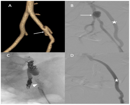 (A,B) Before and after the occlusion of the distal portion of the arteriovenous fistula (arrow, head arrow). (C) Before the occlusion of pseudoaneurysm (star). (D) The occlusion of the proximal portion using first- and second-generation plugs (arrow), and the occlusion of the pseudoaneurysm using multiple 3D coils.