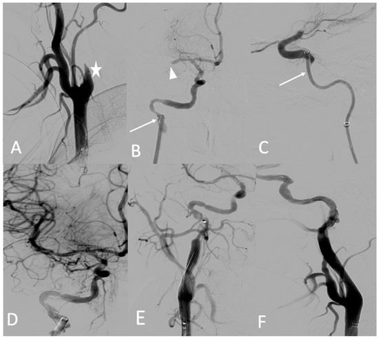 (A) Digitally subtracted image from the right common carotid angiogram showing occlusion over the dissection of the right internal carotid artery (star); (B,C) crossing the dissection by a Sofia 6 F aspiration catheter (arrows) and the occlusion of the proximal portion (M1) (arrowhead); (D) anterior view after mechanical thrombectomy; (E,F) anterior and lateral views after the deployment of the carotid wall stent.