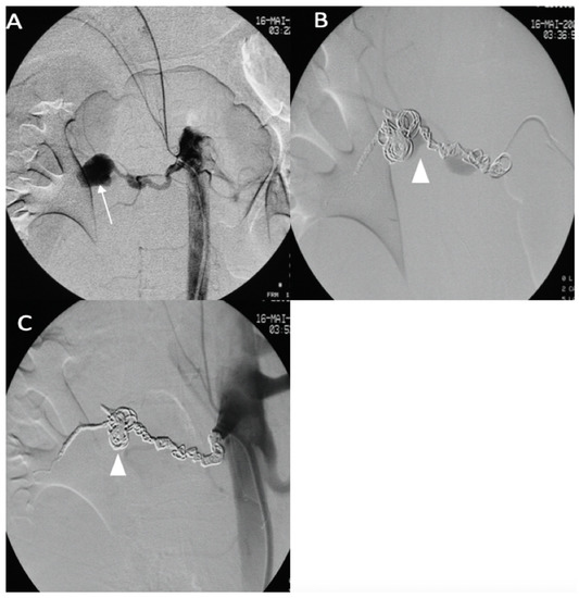 (A) Digitally subtracted image from the right renal artery revealing the distal aneurysm with irregular walls (arrow). (B,C) Postembolization by coils.