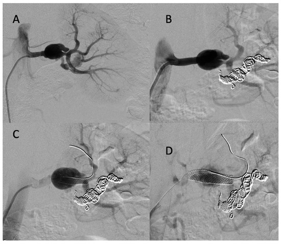 (A) Digitally subtracted image from the left renal artery dissection with aneurysm formation; (B) postembolization of the left retropyelic artery by multiple coils and a small amount of ethylene vinyl alcohol copolymer; (C,D) post-deployment of a two carotid wall stent in the left prepyelic artery.