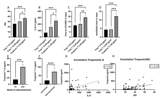 Relationship among ISS, IL-6, need in catecholamines and patient outcome with plasma troponin T. (A) Injury severity score (ISS) in the troponin subgroups of patients. (B) IL-6 concentration in the troponin subgroups. (C) Time on intensive care unit/intermediate care in days in the troponin subgroups. (D) Ventilation time in days in the troponin subgroups. (E) Troponin T concentrations in patients with (yes) and without (no) need in catecholamines. (F) Table 2 Troponin concentrations in survivors and in non-survivors. (G) Correlation analysis between troponin T and IL-6 measurements. (H) Correlation analysis between troponin T level and the ISS. n = 107 patients, * p ≤ 0.05, ** p ≤ 0.01; *** p ≤ 0.001; **** p ≤ 0.0001.