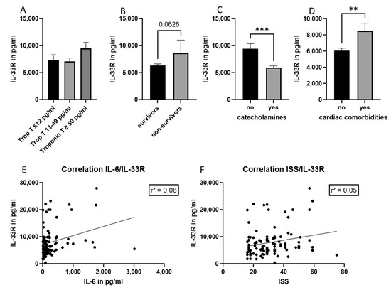 Interleukin 33 receptor (IL-33R) level in different groups of polytrauma patients. (A) IL-33R concentration in different troponin T patient subgroups. (B) IL-33R concentration in survivors and non-survivors. (C) IL-33R concentration in patients with (yes) and without (no) need in catecholamines. (D) IL-33R concentrations in patients with and without cardiac comorbidities. (E) Correlation analysis between IL-33R and IL-6 plasma concentrations. (F) Correlation analysis between IL-33R plasma concentrations and the injury severity score (ISS). n = 107 patients, ** p ≤ 0.01; *** p ≤ 0.001.
