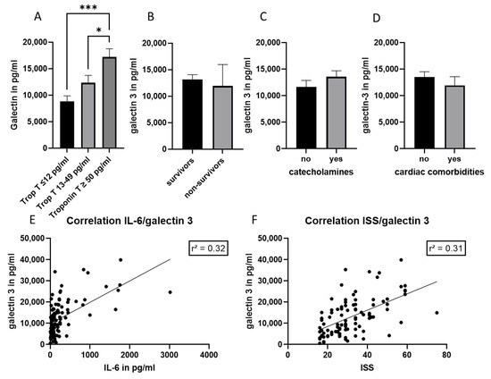 Galectin-3 concentration in different groups of polytrauma patients. (A) Galectin 3 concentration in the troponin T patients’ subgroups (≤12 pg/mL; between 13–49 pg/mL and ≥50 pg/mL). (B) Galectin-3 concentration in survivors and non-survivors. (C) Galectin-3 concentration in patients with (yes) and without (no) need in catecholamines. (D) Galectin-3 concentrations in patients with and without cardiac comorbidities. (E) Correlation analysis between galectin-3 and IL-6 plasma concentrations. (F) Correlation analysis between galectin-3 plasma concentration and the injury severity score (ISS). n = 107 patients, * p ≤ 0.05; *** p ≤ 0.001.