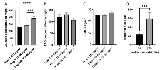 Cardiac risk factors and comorbidities in different groups of polytrauma patients. (A) Initial blood glucose concentration in the troponin subgroups (≤12 pg/mL; between 13–49 pg/mL and ≥50 pg/mL). (B) Initial triglyceride (TAG) blood concentrations in the troponin patients’ subgroups. (C) Body mass index (BMI) in the troponin subgroups. (D) Troponin T concentrations in patients with and without cardiac comorbidities. n = 107 patients, *** p ≤ 0.001 and **** p ≤ 0.0001.