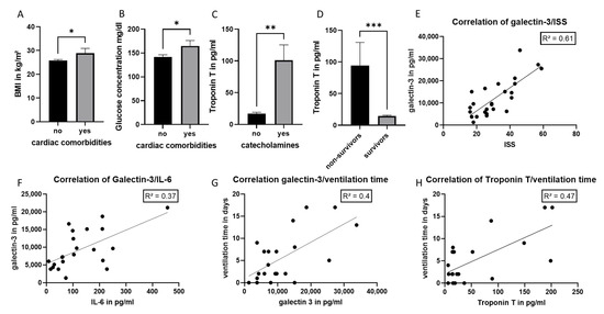 As troponin T and IL-33R concentrations significantly differ in the patients with cardiac comorbidities, we analyzed this group of patients in detail. Figure 5A,B shows that BMI and initial blood sugar levels were significantly increased in these patients. Furthermore, in this subgroup, the troponin level was significantly increased in patients who needed support by catecholamines and non-survivors (Figure 5C,D). A moderate correlation was found between galectin-3 and ISS, and a weak correlation between galectin-3 and IL-6 concentration, as well as ventilation time, was found (Figure 5E,G). In addition, ventilation time in this group of patients was found to correlate weakly with troponin T concentration (Figure 5H).