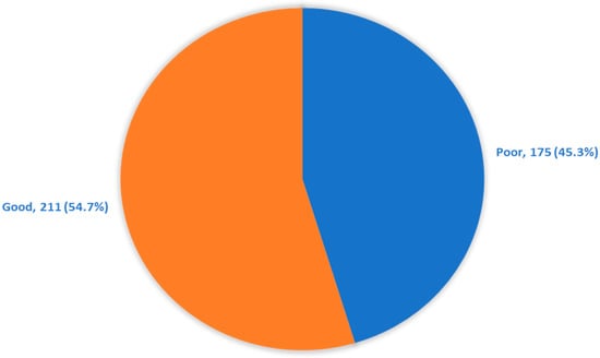 Table 3 illustrates the diabetic patients’ knowledge regarding diabetes and DR. Most of the diabetic patients (73.3%) knew that they must have eye check-ups regardless of their blood sugar level, and 37.8% knew that diabetics should undergo an eye check-up every year. About half of the studied patients (50.8%) did not believe that they needed to have their eyes checked; they believed this was only necessary when they had symptoms. Additionally, 80.3% of the patients agreed that DM can affect the retina, 56% agreed that diabetic complications are always symptomatic, and 84.5% knew that DM can affect their eyes. The fact that blindness is a complication of diabetic retinopathy was known by 65% of the diabetic patients, but only 26.7% knew that there are available treatments for DR. Blood sugar control as a preventive measure for DR was known by 69.9% of patients, and 53.9% knew that they can prevent DR by a good BP control. Additionally, 75.9% of the studied patients knew that they could prevent DR by a regular visit to the ophthalmologists. In total, 211 (54.7%) of the patients had a good knowledge of DM and DR (Figure 1).