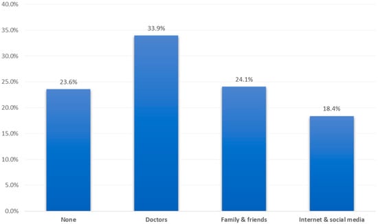 As for the sources of the patients’ information regarding DM and DR (Figure 2), the most reported source was from their doctors (33.9%), followed by their family and friends (24.1%), and the internet and social media (18.4%), while 23.6% had no source of information.